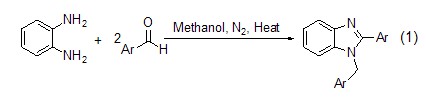 鄰二胺和兩當(dāng)量的芳香醛在甲醇中反應(yīng)時,生成相應(yīng)的五元氮雜環(huán)的并咪唑衍生物 (式1)[3]。
